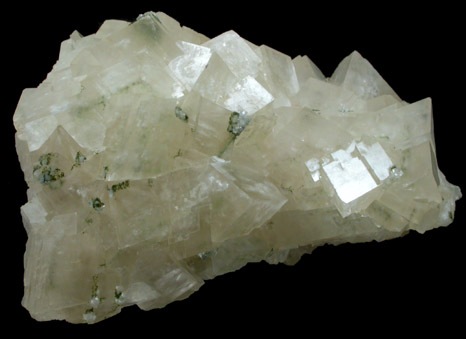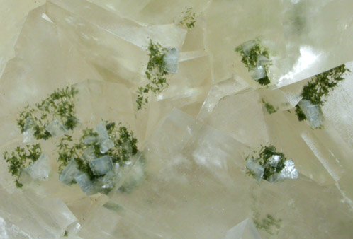 | Description: | Rhombic transparent pale-yellow calcite crystals up to 14 mm with small green duftite crystals up to 1.5 mm. The duftite crystals are clustered around the corners of the calcite crystals and are mixed with smaller calcite crystals. |