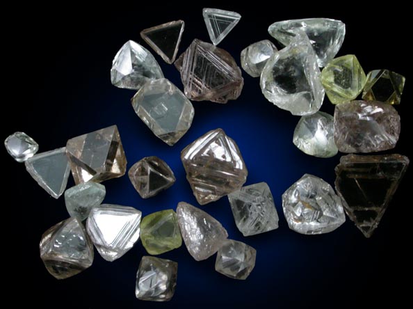| Description: | Collection of 27 small diamond crystals with varying color and crystal forms including several brown and yellow octahedrons and some colorless macles (triangular crystals twinned in the {111} plane). Weights average 0.0.5 carats each. Ex. Dr. Donald Miller collection; ex. Dr. Irene S. Leung, first to discover the presence of lonsdaleite in diamonds, Professor of Geology and Geography at Lehman College |
