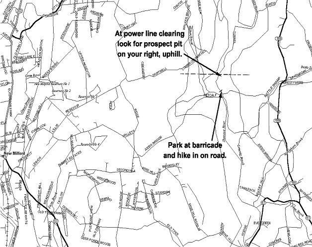 Directions: The collecting area isaccessed from a small town park, on Judds' Bridge Road (off Ct. Rt. 199, on the east side of the Shepaug River). Drive in past junction of Battle Swamp Road on your right. Park where the tree is laid across the road. Continue along old Judd's Bridge Road (also labeled as Tunnel Road on some maps) to the clearing where the power lines cross the road. The best diggings are on your right, uphill 50 feet. It is an overgrown 12 foot pit, that may have water in the bottom. Minerals can be found throughout the immediate area.