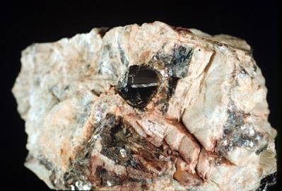 Most of the pegmatite consists of quartz, perthite, graphic granite, and plagioclase in varying proportions, with accessory muscovite, spessartine, elbaite, schorl, beryl, and columbite-tantalite. During mining, muscovite books were found ranging in size up to12 inches in diameter and 4 inches thick. The muscovite shows a grating-type stain, forming a reticulated internal pattern, probably due to magnetite inclusions.