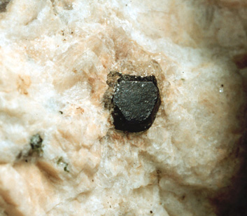 | Figure 19 - The southern excavation at the Hollister quarry in 1996. | Figure 20 - Sharp complex crystal of microlite one half inch across in albite from the Hollister quarry collected by Richard Schooner. Wesleyan University Natural History Museum Collection No. 13803. |