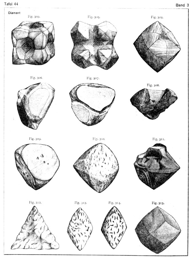 In 1916 Victor Goldschmidt published the nine volume Atlas der Krystalformen. It was a compilation of crystal diagrams from many books and references. Below are links to 300 dpi black and white scans of the 22 pages from the atlas containing diamond crystal drawings. Because the diamond drawings were derived from many different sources, the style varies from line drawings to shaded illustrations. Because these were scanned from a second-generation copy of the Atlas, the quality varies. But it is the most comprehensive collection of diamond crystal illustrations available.
