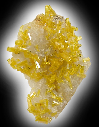| Description: | Thin plate of white quartz matrix with scattered bright yellow lustrous mimetite crystals to 3 mm. |