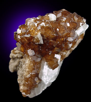 | Description: | Golden-brown fluorite crystals to 5 mm with pale blue celestine (celestite) blades to 10 mm long. The fluorite fluoresces yellow-white under UV illumination. |
