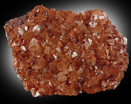 | Description: | Plate covered with flattened rhombic crystals of colorless calcite with red hematite inclusions. |