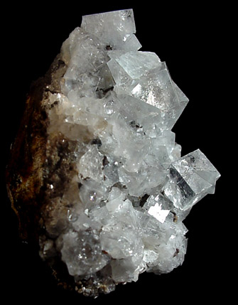 | Description: | Transparent colorless cubic crystals of fluorite to 1 cm on plate of matrix. Most of the fluorite crystals are penetrant twins. Internally a pale purple zone is visible. Uncommon color for fluorite from this mine. |