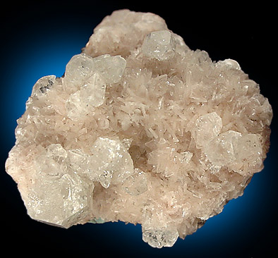 | Description: | Aesthetic specimen of well crystallized pink crystals to 3 mm covering matrix. Overgrowth of transparent colorless apophyllite crystals to 10 mm. |