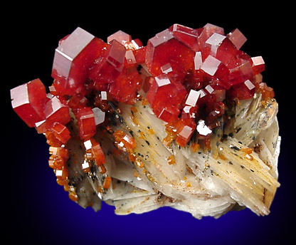 | Description: | Bright red, lustrous vanadinite crystals up to 8 mm on matrix of bladed, white barite crystals. Has custom made black base for displaying upright. |