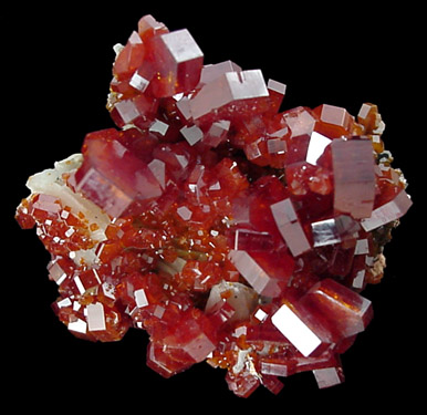 | Description: | Bright red crystals of lustrous vanadinite to 7 mm on white bladed crystals of barite. The color and luster are exceptional. Very showy specimen with |
