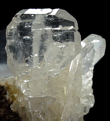 | Description: | Excellent little Faden-growth quartz cluster with a transparent formation 3 cm high on matrix (rare) with other clear quartz crystals. |