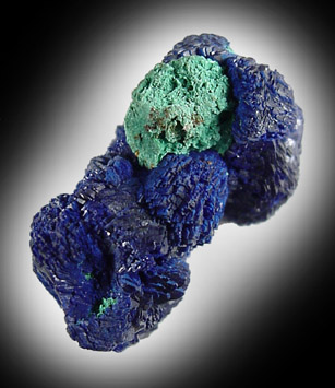 | Description: | Elongated cluster of intersecting bright blue azurite rosettes to 9 mm with a bright green malachite 7mm crystal rosette nestled in the middle. |