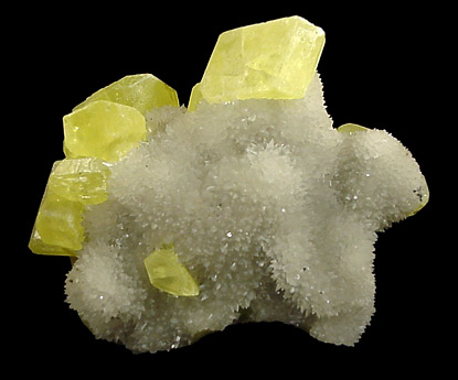 | Description: | Bright yellow crystals of lustrous sulfur overgrown on druzy white calcite. The specimen is a flattened plate fully crystallized front and back. All crystals are clean and complete. ex. Al Sebela (1921-2000) collection |