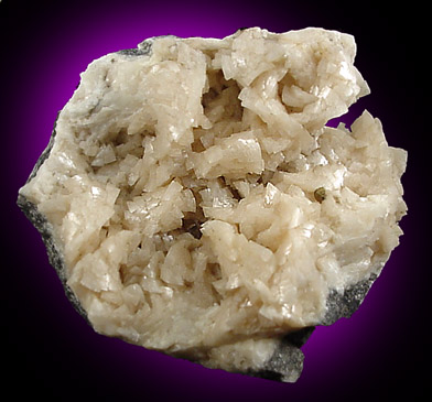 | Description: | Pinkish-tan colored, saddle-shaped dolomite crystals up to 5 mm with two brassy chalcopyrite crystals up to 2 mm. |
