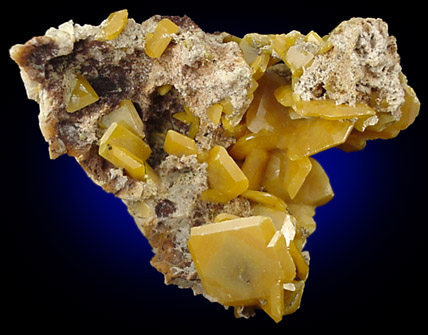| Description: | Yellow-orange wulfenite crystals with beveled edges lining a cavity in matrix. The largest crystal is located on arm of matrix suspended over the rest of the wulfenite - very aesthetic. All crystals complete, though minor edge frittering. |