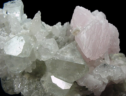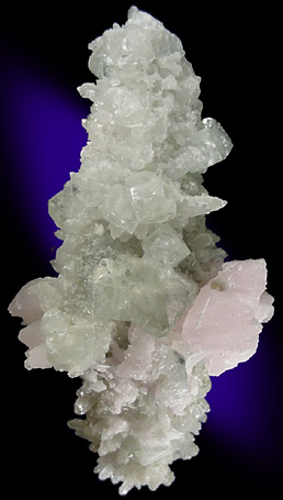 | Description: | Stalactitic formation of greenish cubic fluorite crystals up to 13 mm with pink manganocalcite up to 15 mm and colorless quartz up to 10 mm. Fully crystallized on all sides except where attached on the rear. |