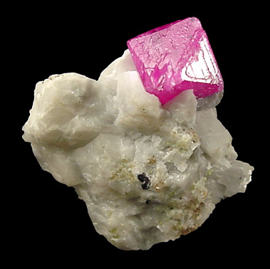 | Description: | Single crystal of bright red corundum (variety Ruby) on white marble matrix with minor phlogopite. Crystal faces show the typical growth patterns found in corundum. One corner on the rear is incomplete. Fluoresces red under UV illumination. |