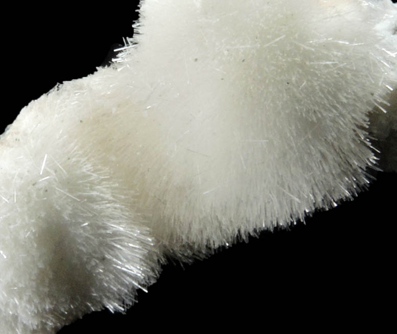 | Description: | Lustrous acicular white natrolite crystals in radiating spray-shaped aggregates with a fragment of greenish basalt on one end. This quarry is now closed and reclaimed. Collected in October 2001 during MMMS field trip. |