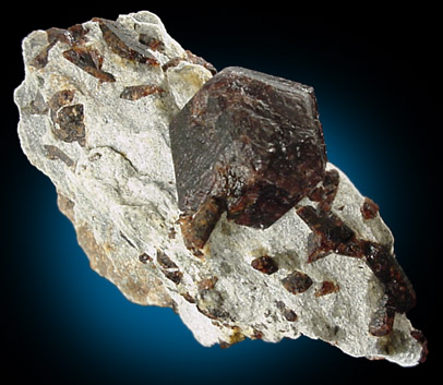 | Description: | Dark red almandine garnet crystal 25 mm across in silvery schist matrix with minor staurolite crystals up to 10 mm. The almandine crystal is quite large for the locality. Locality closed to collecting in 2012. Collected ca. 1992 |