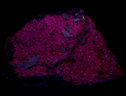 | Description: | Pale lavender-pink calcite crystals up to 2 mm coating one side of plate of matrix. Overgrown on the calcite are colorless cerussite crystals up to 7 mm. The calcite fluoresces orange under UV illumination. |