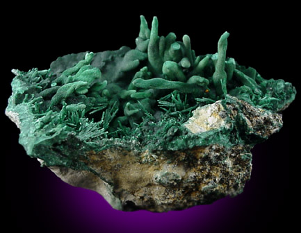 | Description: | Unusual formation of green malachite crystals in elongated, twisting shapes standing upright off matrix. Most are complete and undamaged |