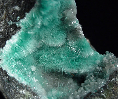 | Description: | Bright blue sprays of acicular aurichalcite crystals up to 5 mm long lining the inside wall of a cavity in matrix. |