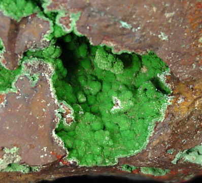 | Description: | Bright green, spherical conichalcite crystals 1 mm diameter covering matrix (and lining vugs). Several cavities on front and top with brightest green conichalcite (could be trimmed to expose these cavities better). Originally acquired in 1968. Ex. Dr. Eugene E. Sensel (1911-2000) collection #G596 |