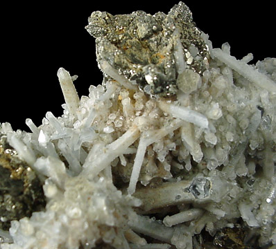 | Description: | Cluster of elongated milky quartz crystals up to 3 cm long with irregular rosettes of pyrrhotite crystals up to 4 cm across. |