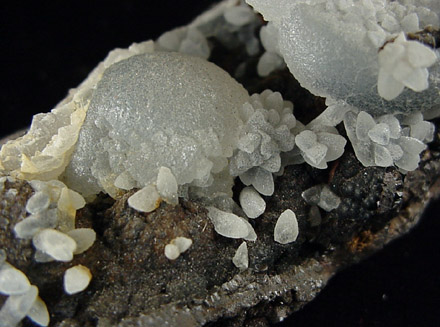 | Description: | Hemispherical crystal aggregates of translucent, colorless smithsonite on limonite matrix. Several individual smithsonite crystals are scattered around too. Bottom is sawn flat. |