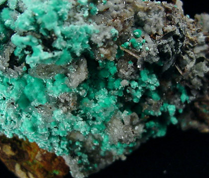 | Description: | Brilliant blue-green aurichalcite crystals richly covering matrix. Under magnification can be seen rosettes up to 2 mm diameter of acicular crystals. |