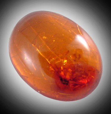 | Description: | Oval cabochon of natural amber with insect included within. The cabochon has been polished to show the interior clearly. Some crazing of the amber due to age. |