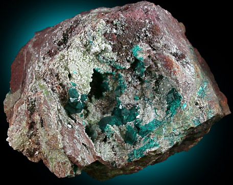 | Description: | Very large specimen with a 8x8 cm cavity in the center lined with scattered green dioptase crystals (up to 2 cm!) and small colorless calcite. This is a great specimen with exceptional dioptase crystals in their natural environs. |