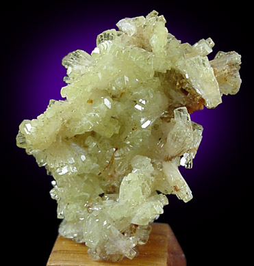 | Description: | Sparkling cluster of well crystallized yellow adamite crystals mounted to small wooden support base (can easily be removed).The crystal luster and translucency are exceptional. Fluoresces bright green under UV illumination. |