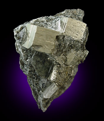 | Description: | Two lustrous pyrite crystals formed in a thin vein in mica schist matrix. |