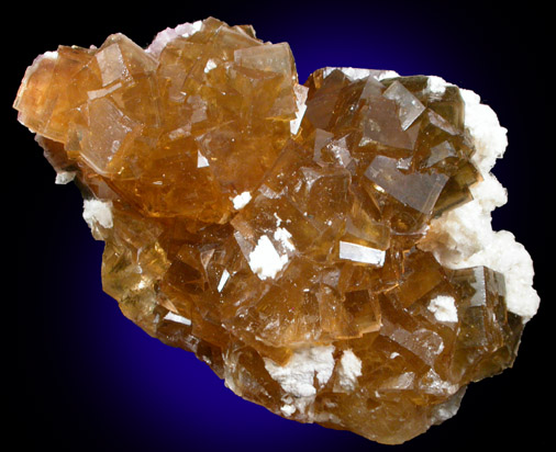 | Description: | Colorful plate of transparent, yellow fluorite crystals with minor white dolomite. The fluorite crystals are cubic form with lustrous surfaces and fluoresce white under UV illumination. Minor damage in one area does not detract from the gemmy specimen. |