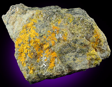 | Description: | Radioactive specimen with black uraninite and orange gummite. |
