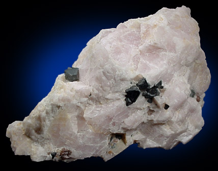 | Description: | Several dark franklinite crystals in pink calcite matrix (fluoresces orange) with minor willemite (fluoresces green). The franklinite crystals are octahedral form and very sharp. |