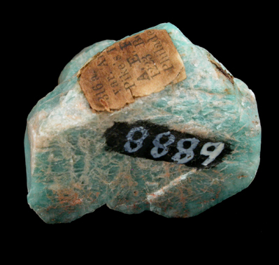 | Description: | Bright blue amazonite crystals in parallel formation. Doubly-terminated with the remnants of an old A.E. Foote label on the bottom (with address showing as 1223 Belmont - where Foote operated from 1879-1891). Excellent color, With copy of Ex. Westtown School (West Chester, Pa.) Collection label no. 6886-88, donated by Lewis Woolman |