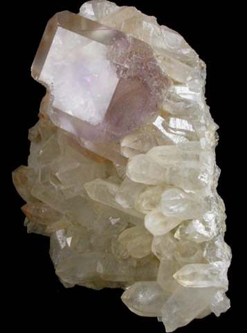 | Description: | Transparent fluorite crystal 23 mm across on matrix of colorless quartz crystals up to 20 mm with minor pyrite. The fluorite crystal is cubic with dodecahedral edge faces and has a purple center zone. |