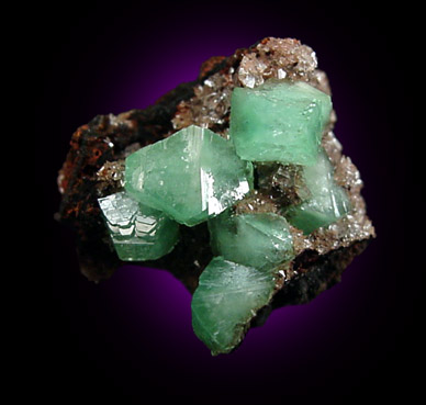 | Description: | Translucent green crystals of cuprian adamite on brown limonite matrix. The crystals are di-pyramidal form and very lustrous. |