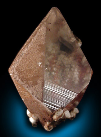 | Description: | Single crystal of scalenohedral calcite with bright inclusions of native copper. The copper is included in the outer layer of three faces of the calcite, leaving the other three faces unobstructed showing a completely flawless interior. From old collection ca. 1890 |