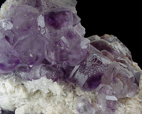 | Description: | Complex fluorite crystals up to 30 mm on dolomite matrix of colorless quartz crystals up to 20 mm and minor pyrite. The fluorite crystals are cubic with dodecahedral edge faces and are water-clear with purple centers.The largest of the lot. |