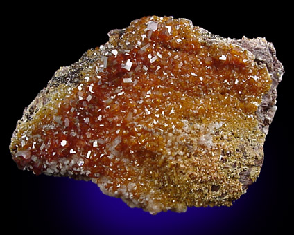 | Description: | Brightly colored specimen of yellow to orange vanadinite crystals up to 2 mm with brown mottramite crystals up to .5 mm. Looks beautiful under magnification. Fully crystallized on all surfaces. |