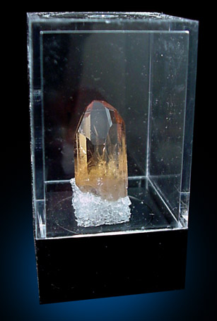 | Description: | Pristine crystal of sherry-colored topaz. The topaz crystal is flawless internally and has many complex faces on the termination. A great specimen (one of the gemmiest crystals I have), no damage. Mounted in display case for protection. |