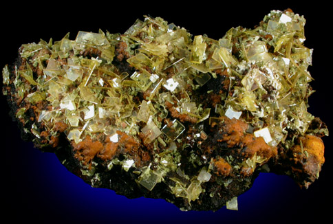 | Description: | Limonite gossan matrix covered throughout with thin, transparent crystals of yellow-green wulfenite and sprays of elongated mimetite crystals. Looks beautiful under magnification - even the matrix sparkles. For more info see Min. Rec. special issue. Ex. Robert C. Linck (1905-1970) |
