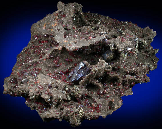 | Description: | Superb cluster of lustrous transparent red sphalerite crystals up to 4 mm on brown limestone with two larger sphalerite crystals up to 20 mm deep in one area with chalcopyrite crystals to 3 mm. The large sphalerite crystals have iridescent blue surfaces. Ex. Robert C. Linck (1905-1970); originally acquired ca. 1930 |