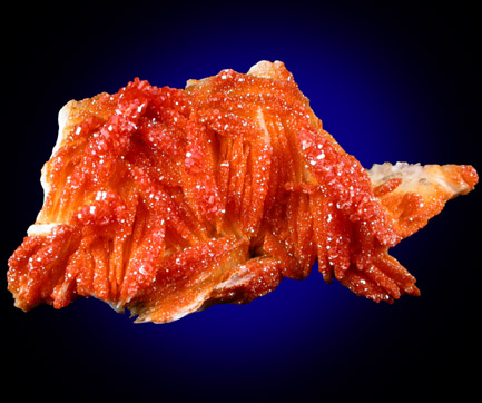 | Description: | Bladed white barite crystals up to 15 mm coated with bright orange vanadinite crystals up to 2.5 mm. Though the vanadinite crystals are small, the bright orange color makes this specimen a real eye-catcher. |