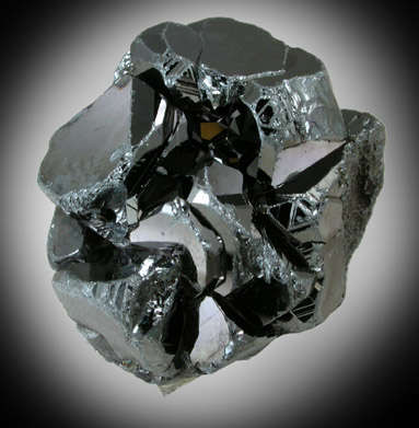| Description: | Complex cluster of cubic hematite crystals. Though the edges are worn (alluvial?) the crystal faces are mirror-like. |