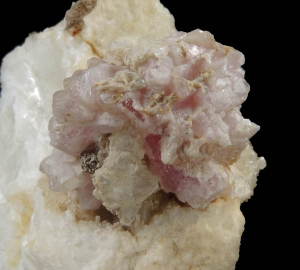 | Description: | Lustrous translucent pale-pink rose quartz crystals to 2 mm in a rosette-shaped cluster 14 mm across on white albite that is coated on the rear with microscopic crystals of phosphate minerals, probably apatite, eosphorite, and possibly others. Collected in June 1969 by Cliff Trebilcock |
