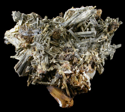 | Description: | Dense cluster of gray stibiconite pseudomorphs after stibnite crystals up to 3 cm long. The stibnite altered to stibiconite atom by atom, leaving the shape of the original stibnite crystals but composed of stibiconite. Collected ca. 1975-6. |