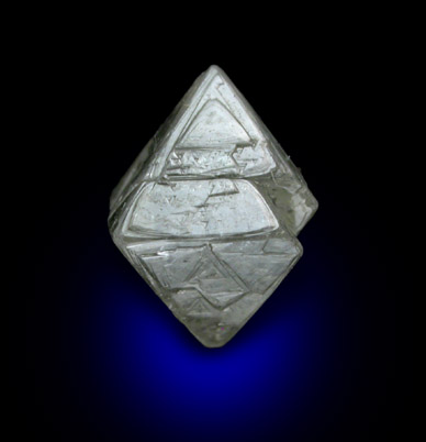 | Description: | Double (twinned) octahedral crystals of natural diamond. The crystal faces show the typical trigons and striations found in diamonds. The color is gray with minor inclusions. One of the best, most translucent diamonds in this lot. |